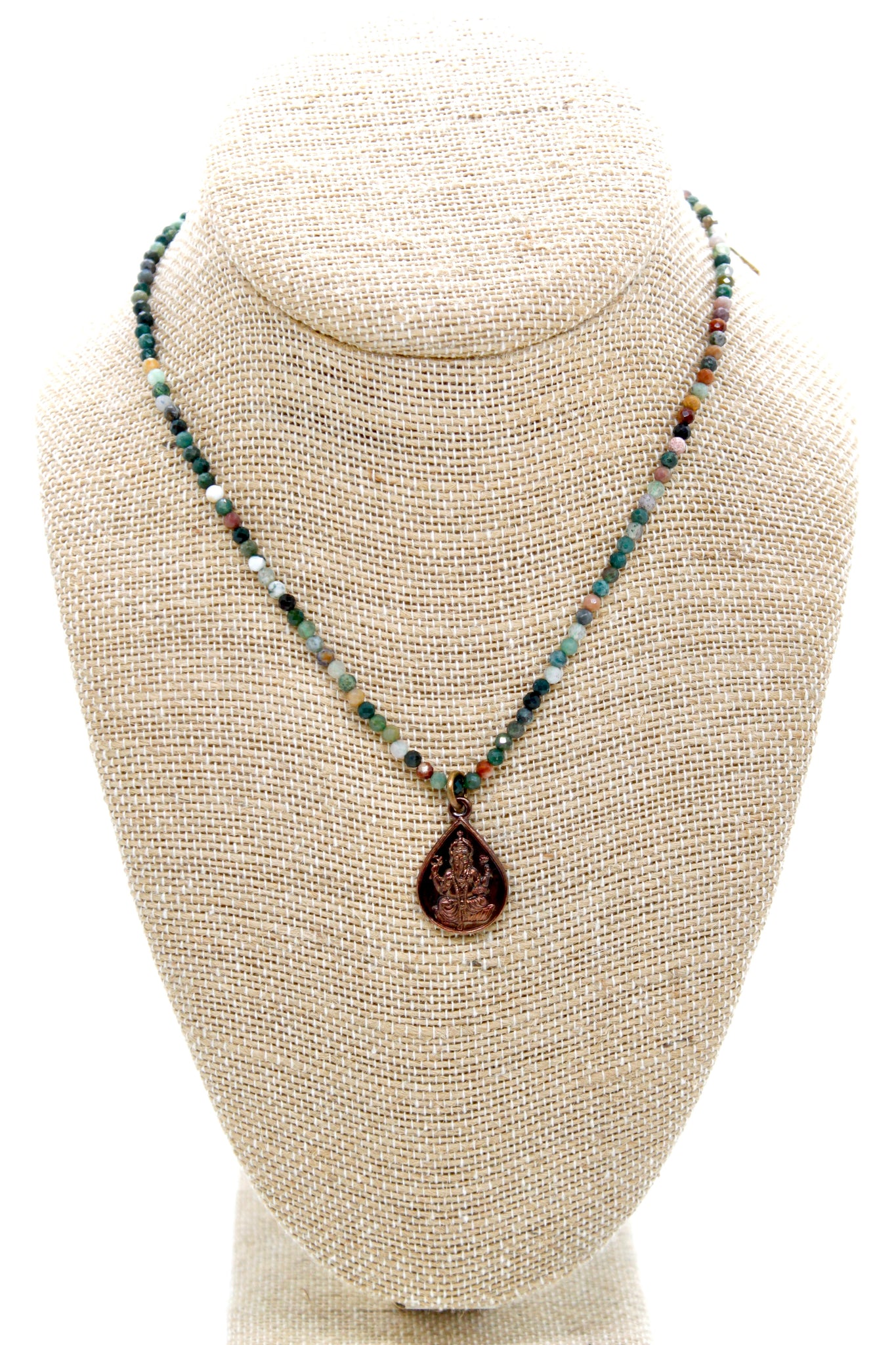 Small Reversible Copper Buddha Charm on semi precious stone necklace.