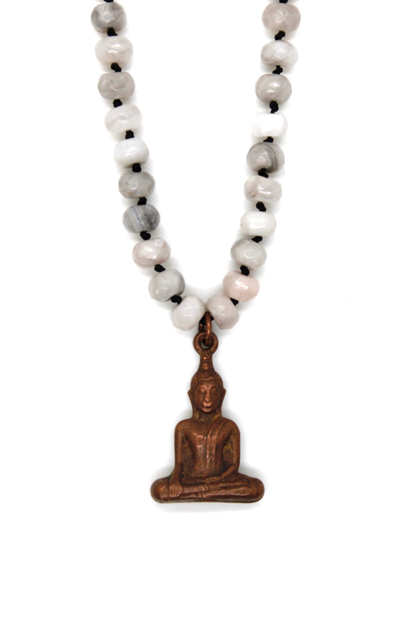 Skip to contentCopper Sitting Buddha on White Lace Agate Knotted Necklace