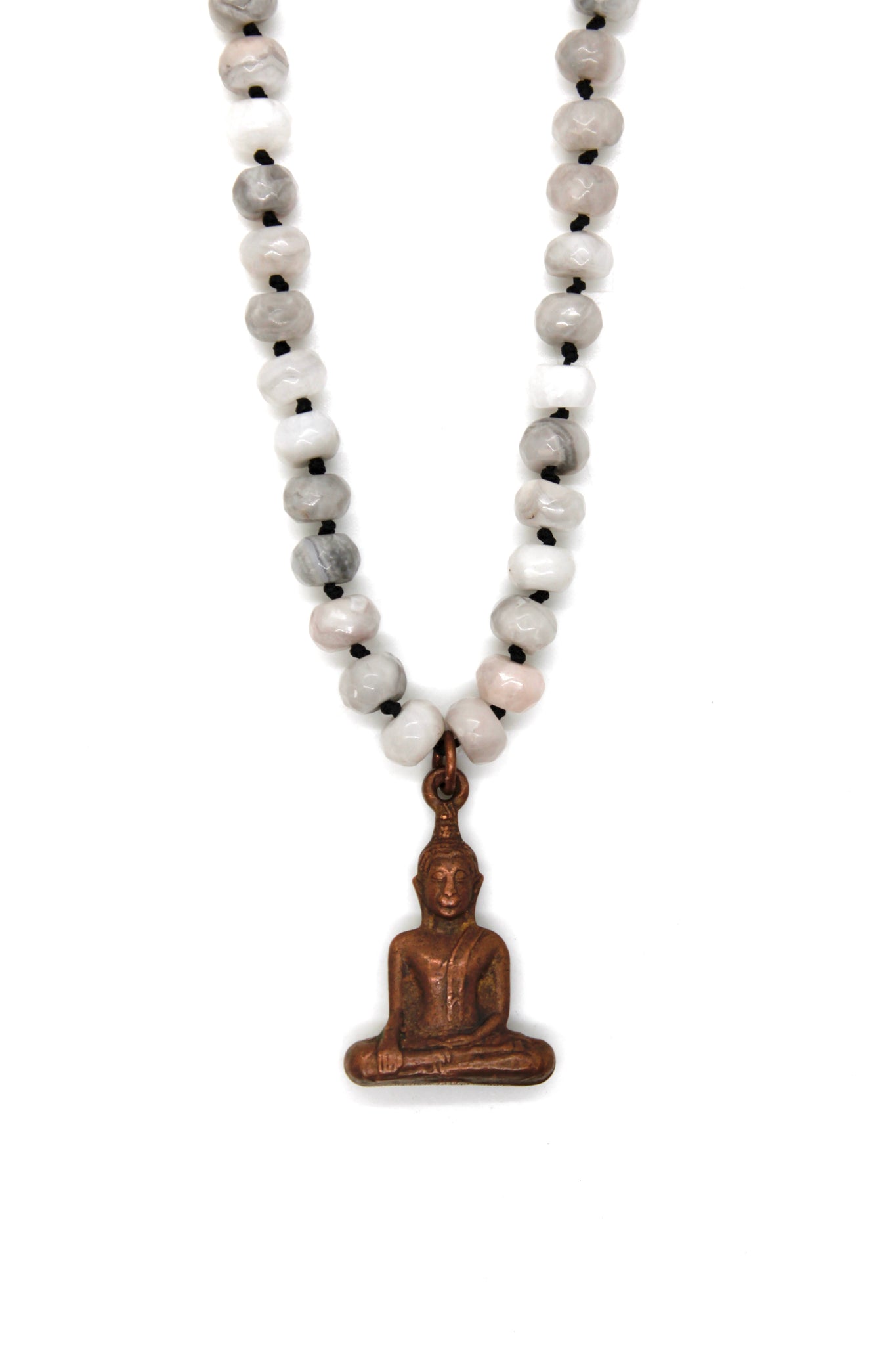 Copper Sitting Buddha on White Lace Agate Knotted Necklace