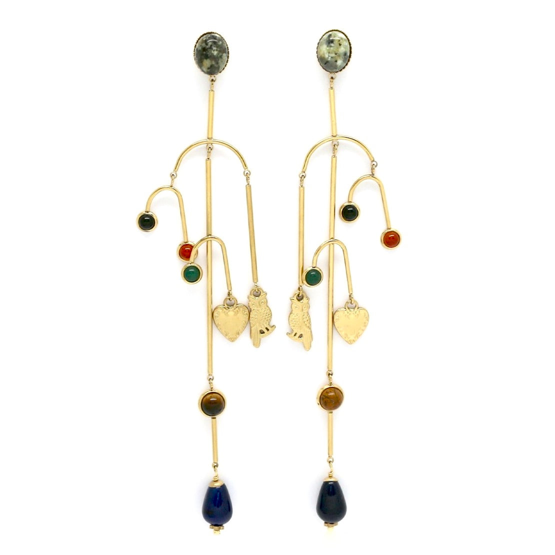 Museum Style Heart and Owl Stone Mobile Earrings - E4-305
