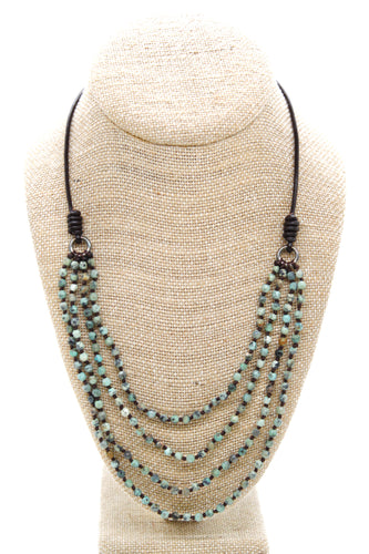 African Turquoise, Mother of Pearl and Quartz Hand Knotted Long Necklace on Genuine Leather -Layers Collection- N5-004