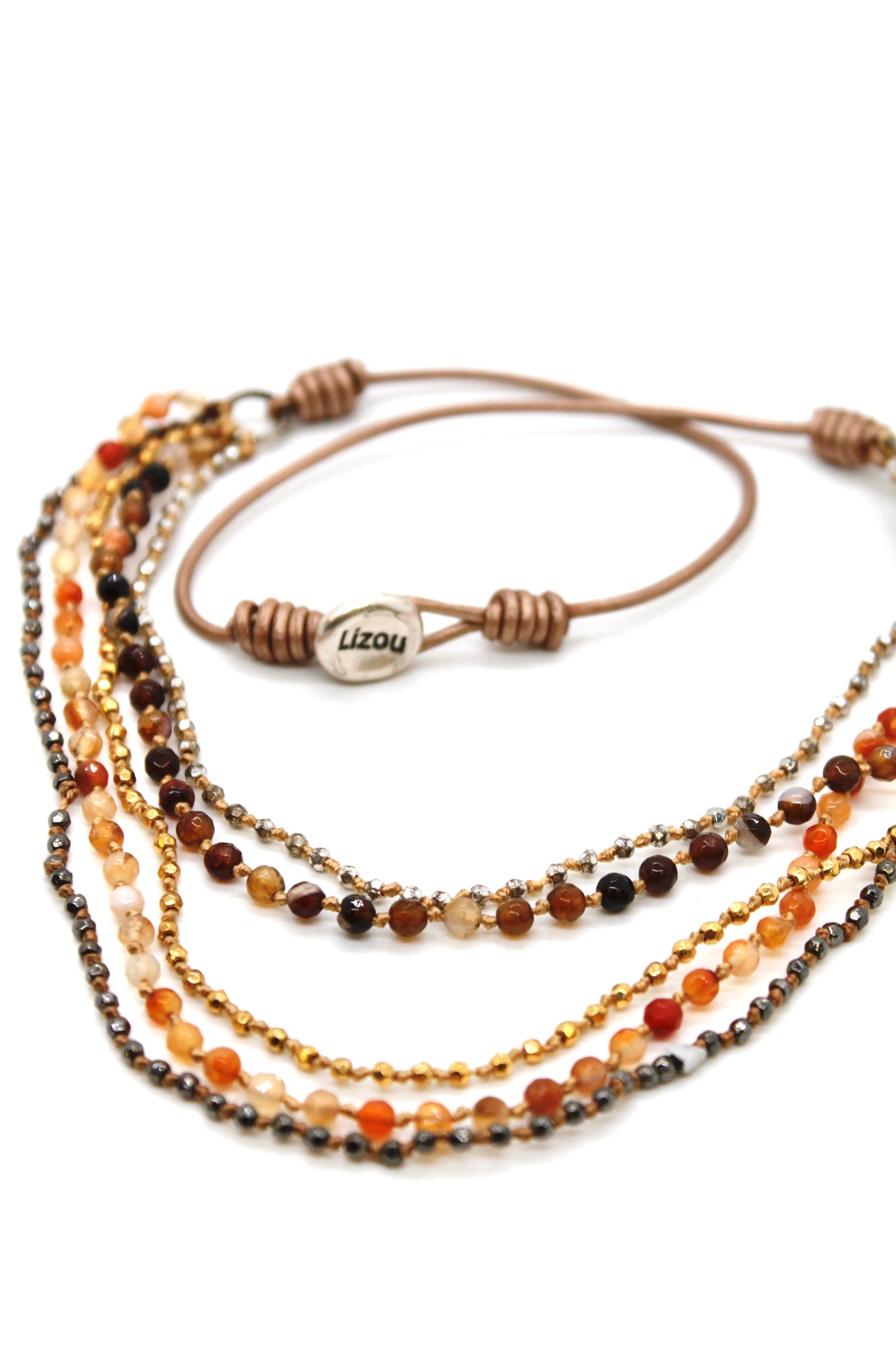 Created after our best selling wrap bracelets, this necklace is meant for those who love a shorter length and desire a matching necklace! Featuring beads that are hand knotted in between each bead for durability, a genuine leather cord, and a silver plated Lizou button clasp. Please note that this necklace is non-adjustable. Pair with the matching wrap bracelet, Autumn, for a complete set!
