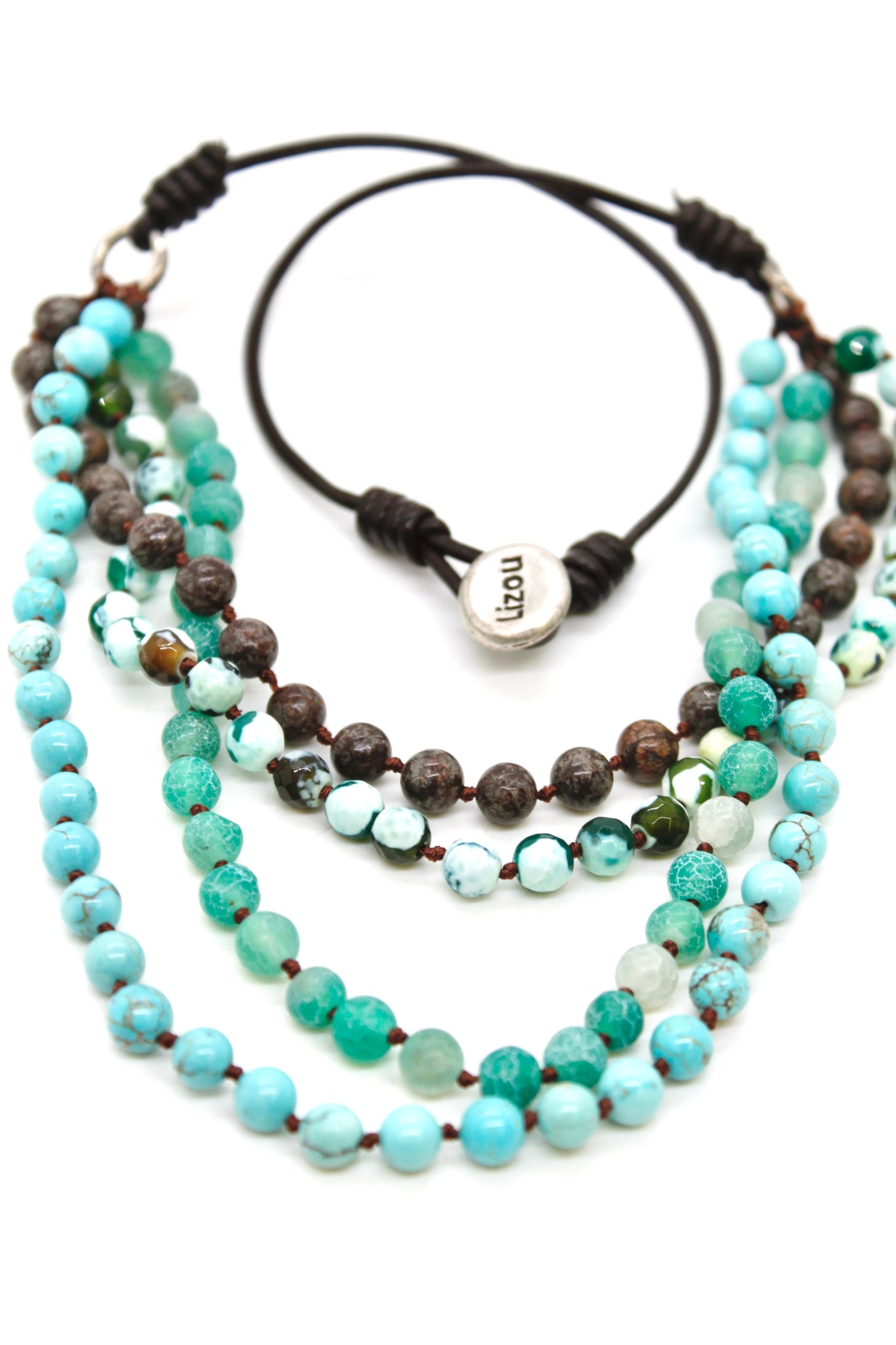 Created after our best selling BL-M bracelets, this necklace is meant for those who love a shorter length and desire a matching set! Featuring beads that are hand knotted in between each bead for durability, a genuine leather cord, and a silver plated Lizou button clasp.