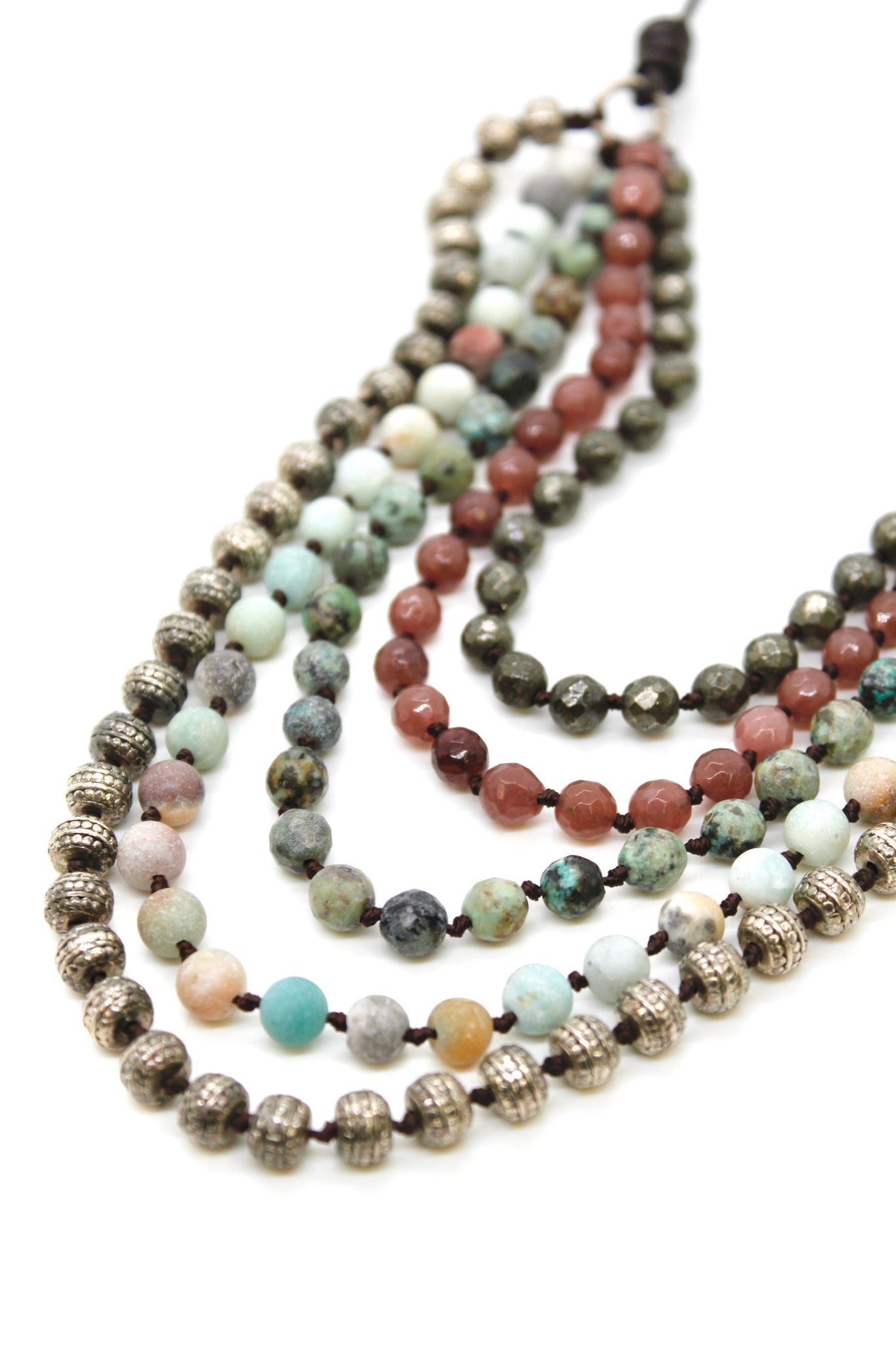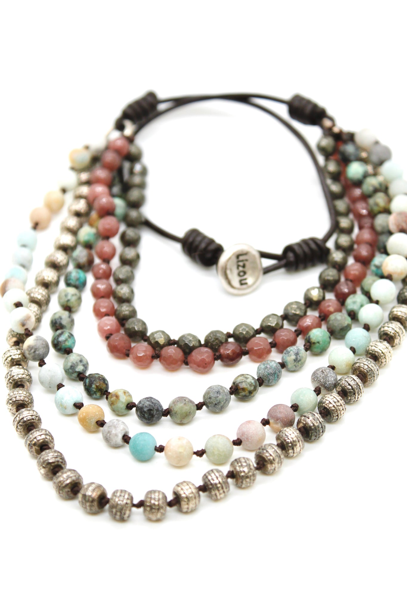 Created after our best selling BL-M bracelets, this necklace is meant for those who love a shorter length and desire a matching set! Featuring beads that are hand knotted in between each bead for durability, a genuine leather cord, and a silver plated Lizou button clasp.