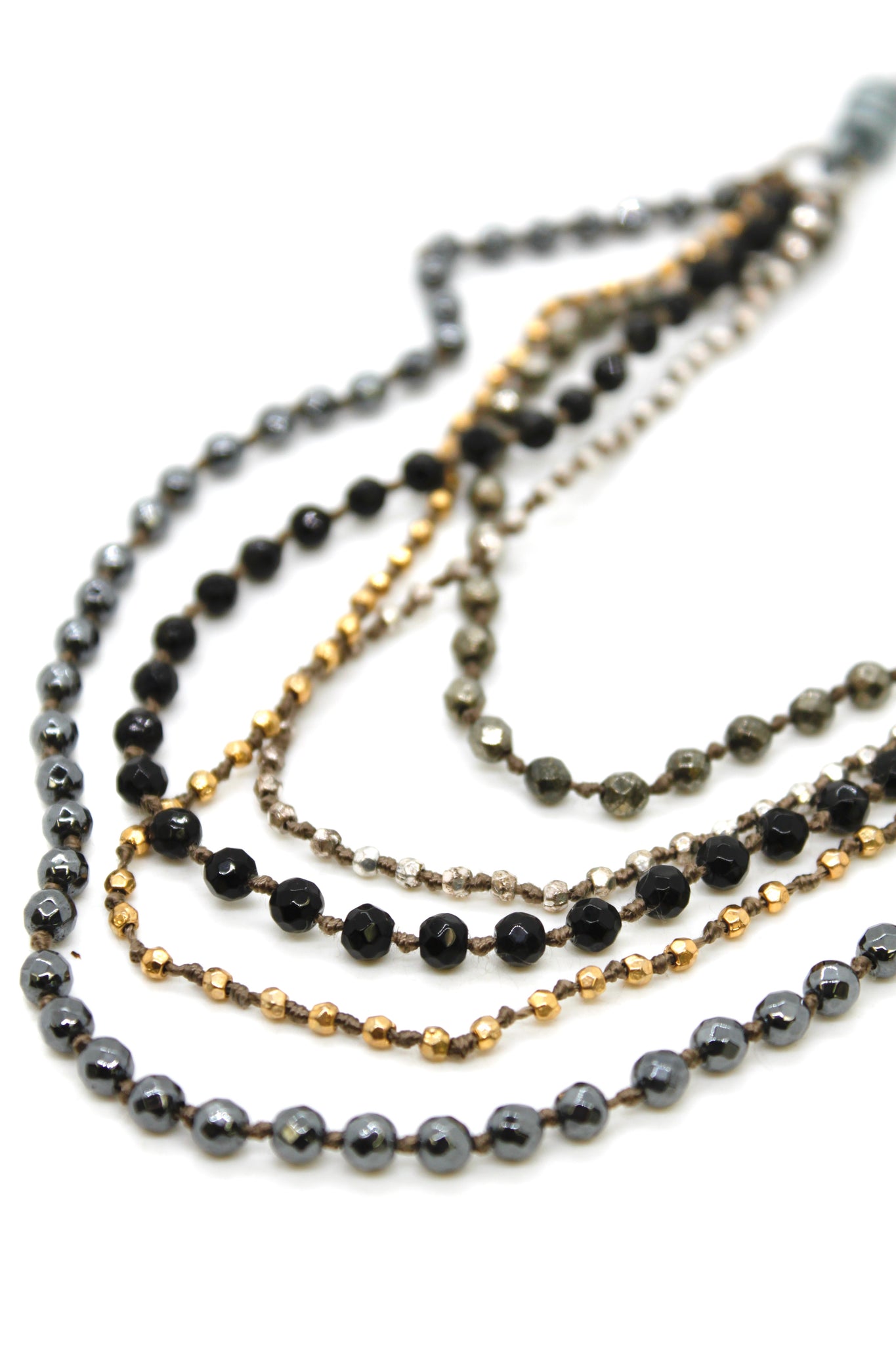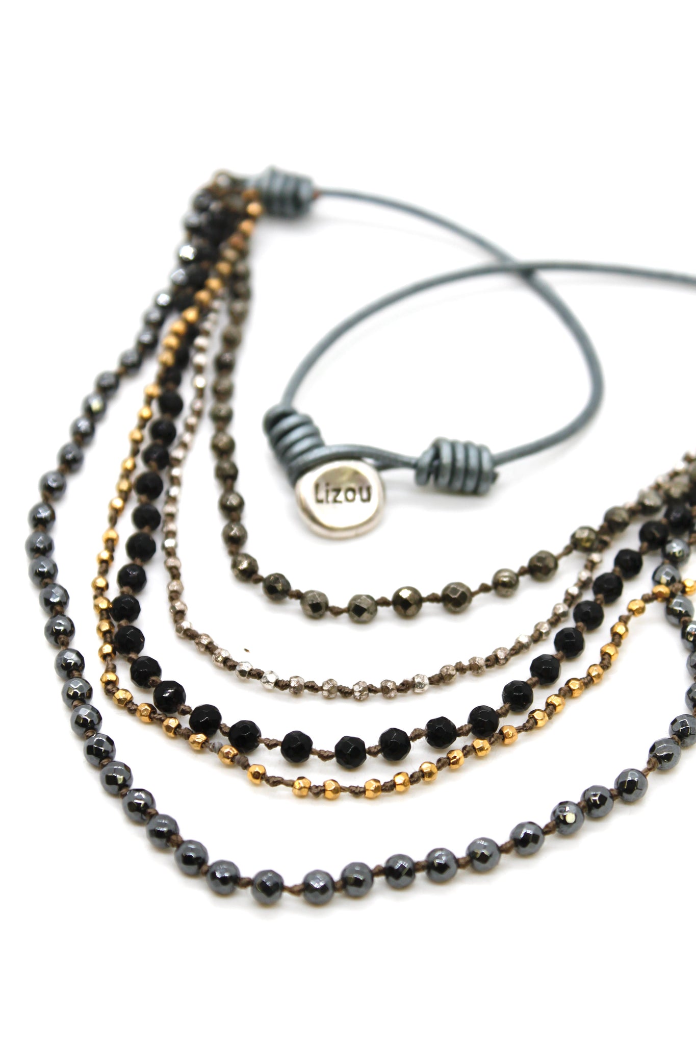 Created after our best selling wrap bracelets, this necklace is meant for those who love a shorter length and desire a matching necklace! Featuring beads that are hand knotted in between each bead for durability, a genuine leather cord, and a silver plated Lizou button clasp. Please note that this necklace is non-adjustable. Pair with the matching bracelet, Viper, for a complete set!